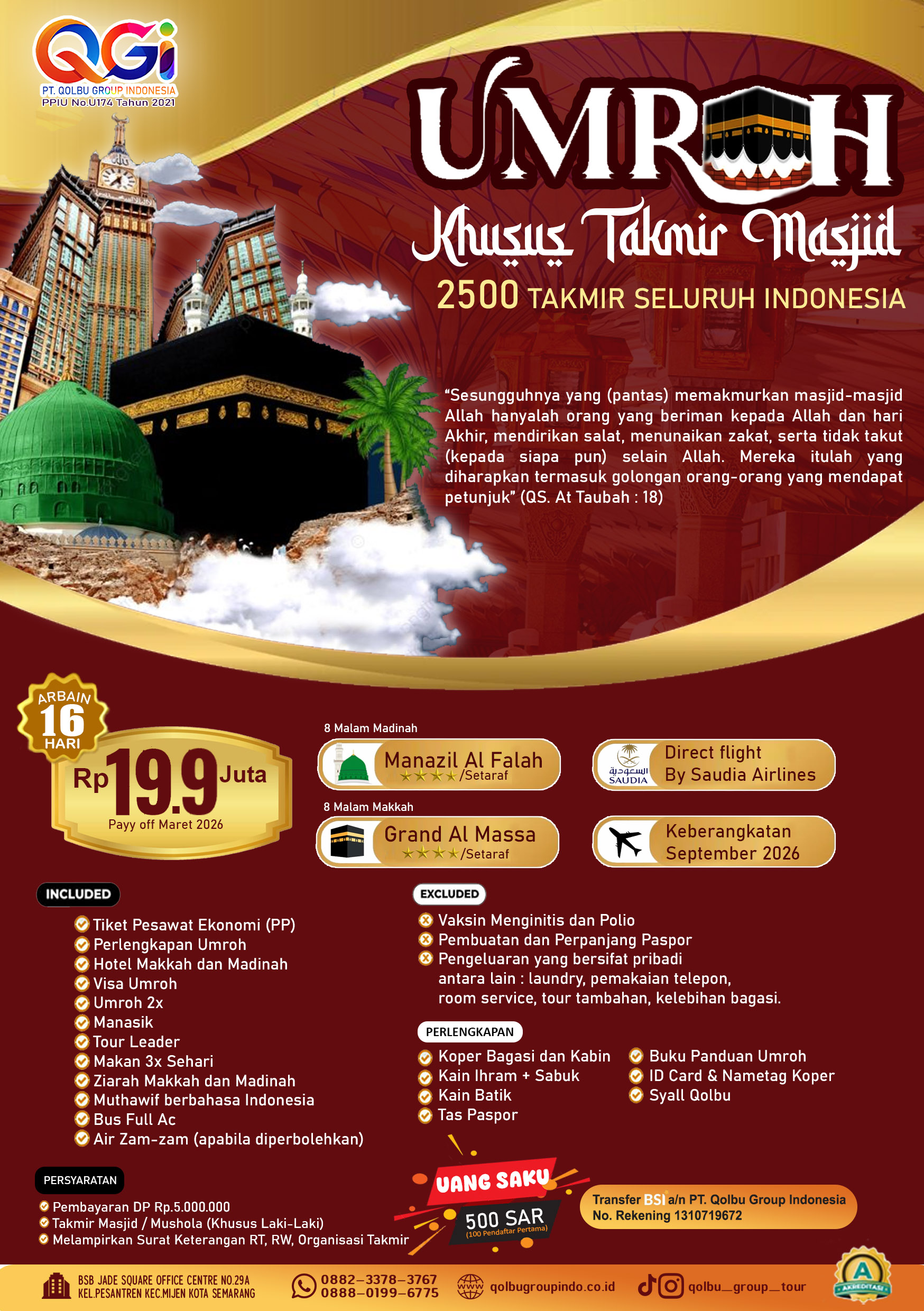 “Sesungguhnya yang (pantas) memakmurkan masjid-masjid Allah hanyalah orang yang beriman kepada Allah dan hari Akhir, mendirikan salat, menunaikan zakat, serta tidak takut (kepada siapa pun) selain Allah. Mereka itulah yang diharapkan termasuk golongan orang-orang yang mendapat petunjuk” (QS. At Taubah: 18)